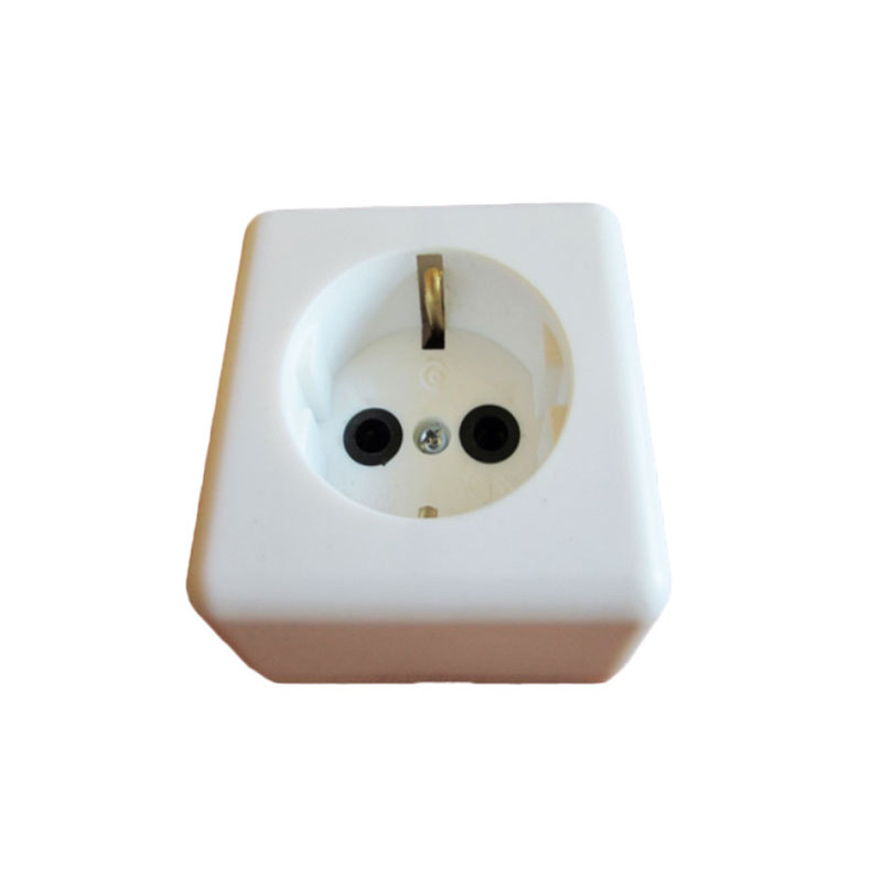 >Wtyczka nakładana z uziemieniem typu Schuko, wykonana z wytrzymałego bakelitu, przeznaczona do montażu naściennego w zastosowaniach domowych lub przemysłowych.