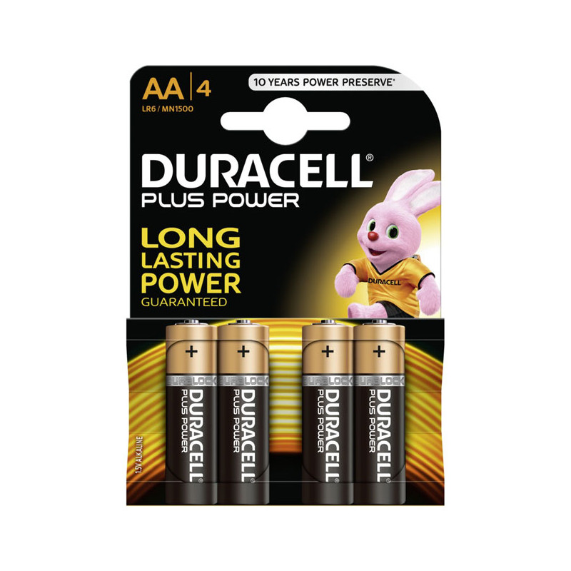 Set de 4 baterii alcaline Duracell Plus Power, format R6 (AA), ideale pentru dispozitive electronice de uz zilnic, oferind performanță fiabilă și durată lungă de funcționare.